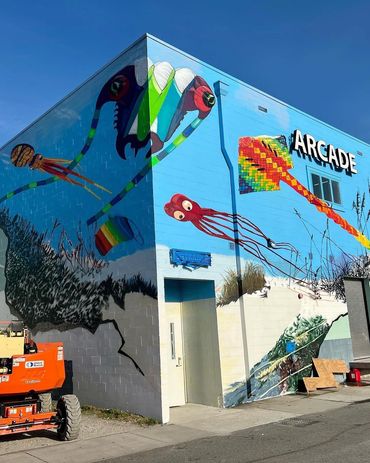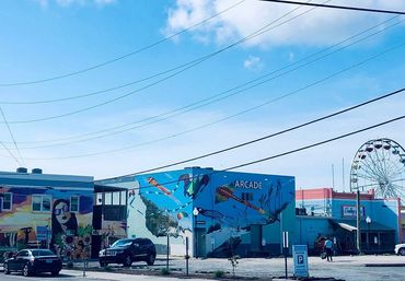The location for mural #10 is the CB Arcade located on 103 Carolina Beach Ave N. The main mural wall is west-facing and the Artist may also wrap the design around to the north-facing wall. The west-facing wall is currently seafoam green and measures approximately 49 ‘long by 25 ‘ high. The north-facing wall is 14’ long by 25’ high.