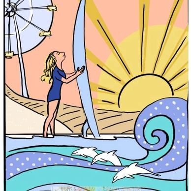 As a graphic designer with a passion for color, Anna infuses this piece with bold, saturated tones that capture both the energy and tranquility of this beloved location. The design uses graphic lines and shapes to create a sense of movement, mirroring the ebb and flow of the ocean. The sky gradually transitions from deep oranges, pinks, and purples to calming lilac, reflecting the one-of-a-kind beauty of each sunset.